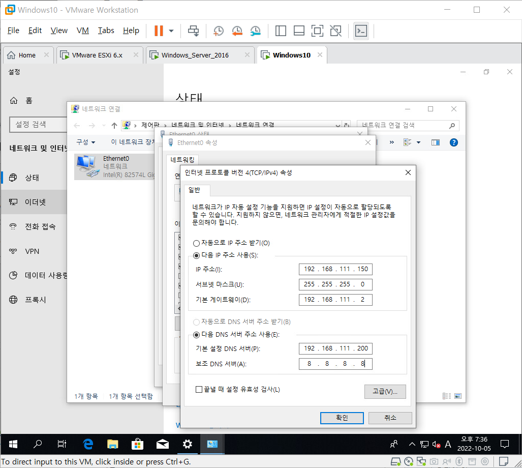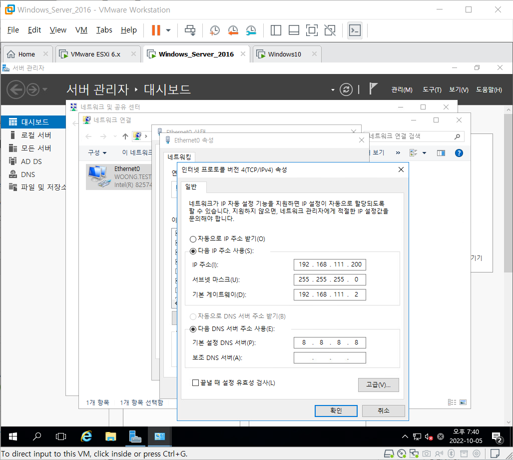 2. Windows IP 설정(192.168.111.150/24) - 기본 설정 DNS 서버에 AD Server IP 입력