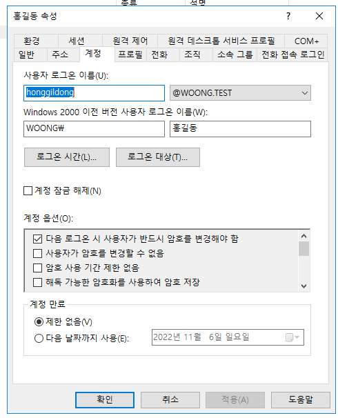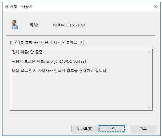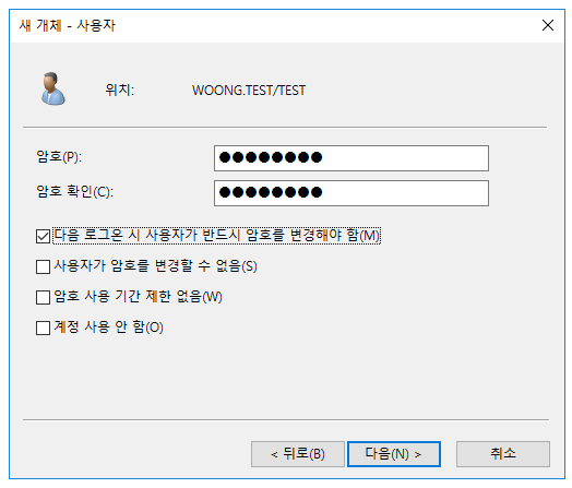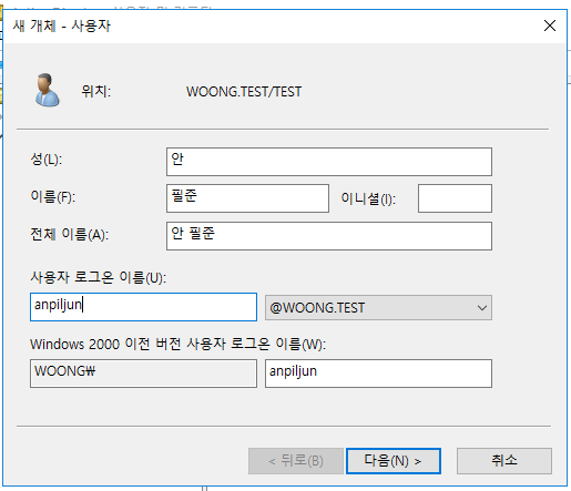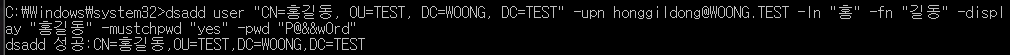 dsadd user "CN=홍길동, OU=TEST, DC=WOONG, DC=TEST" -upn honggildong@WOONG.TEST -ln "홍" -fn "길동" -display "홍길동" -pwd "P@ssw0rd" -mustchpwd "yes"