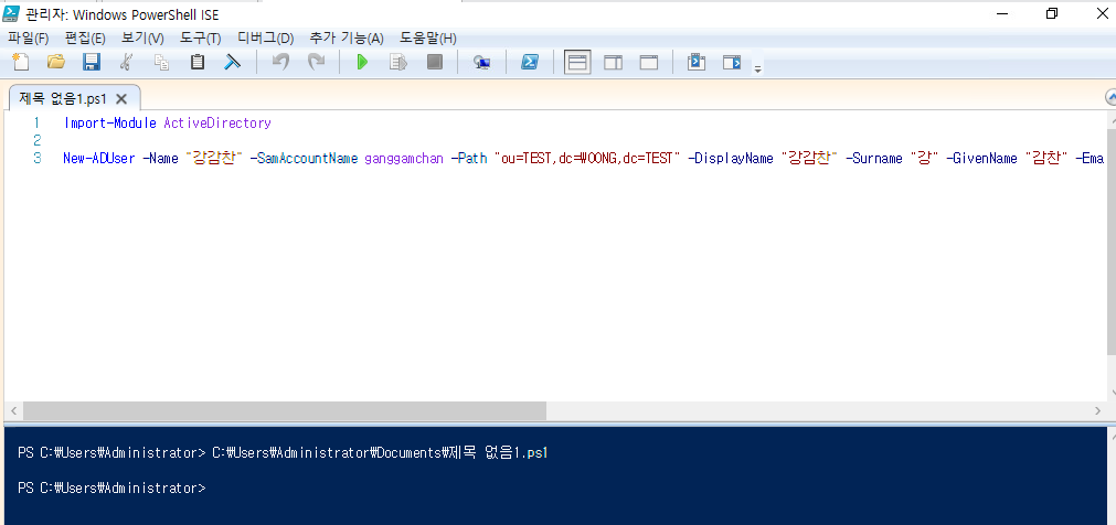 New-ADUser -Name "강감찬" -SamAccountName ganggamchan -Path "ou=TEST,ou=WOONG,dc=TEST" `