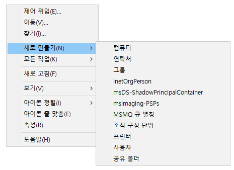 3. “OU”를 선택 후 마우스 “우 클릭” 메뉴 중 “새로 만들기 – (생성할 개채 종류 선택)”를 클릭