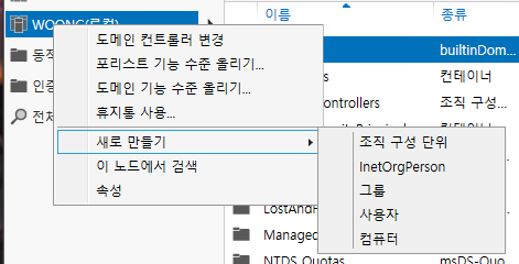 2. 새 도메인 또는 OU를 배치할 도메인 또는 마우스 오른쪽 버튼으로 클릭하고 새로 만들기를 선택한 다음 조직 구성 단위를 선택