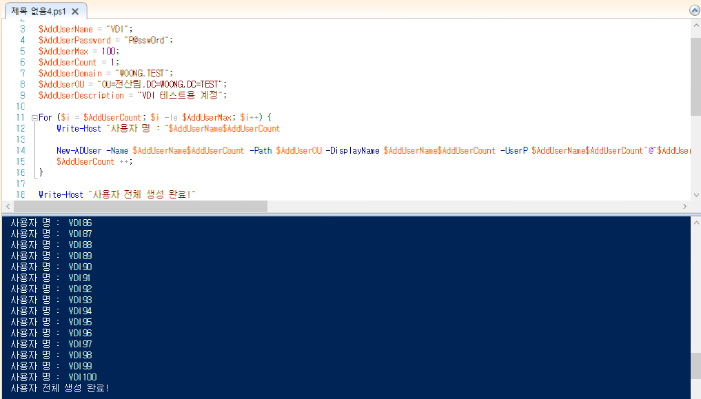 Write-Host "사용자 생성 완료!" # 콘솔 화면에 결과 출력