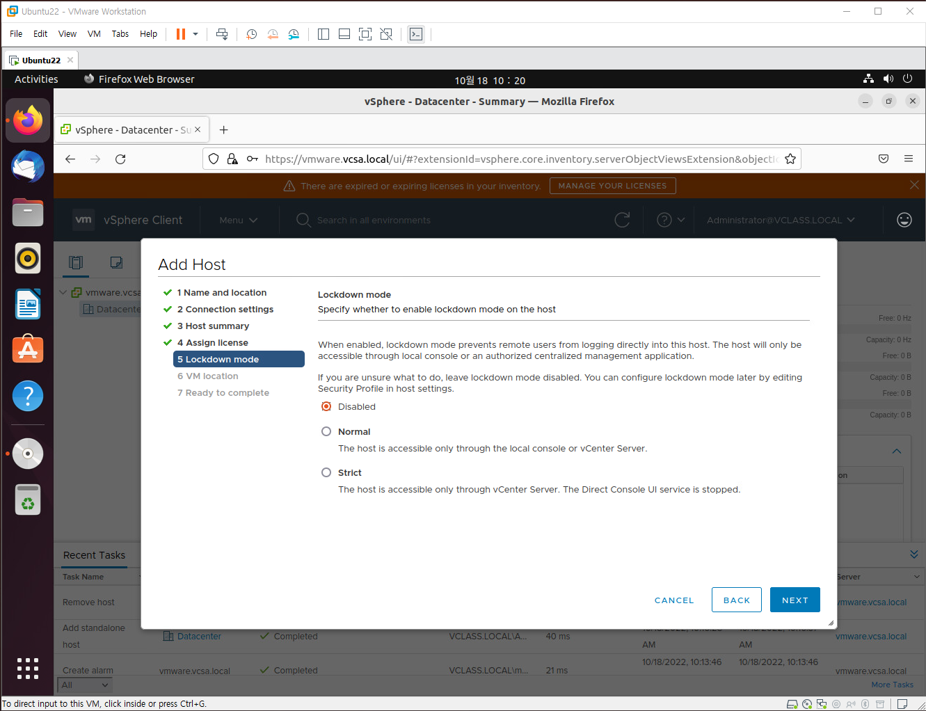 10. vCenter Server가 이 호스트를 제어할 때 관리자 계정의 원격 액세스를 사용하지 않으려면 잠금 모드 옵션을 선택