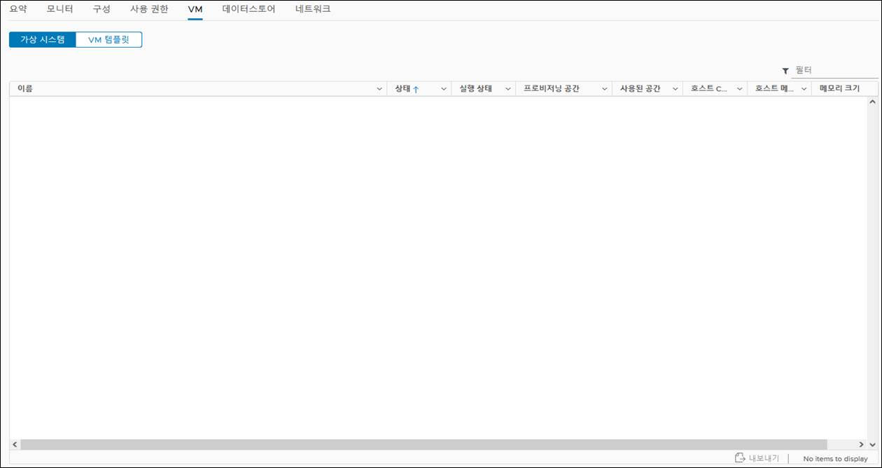 : vCenter 접속 -> 호스트서버 선택 -> VM 탭 -> VM 비어있음 확인