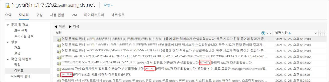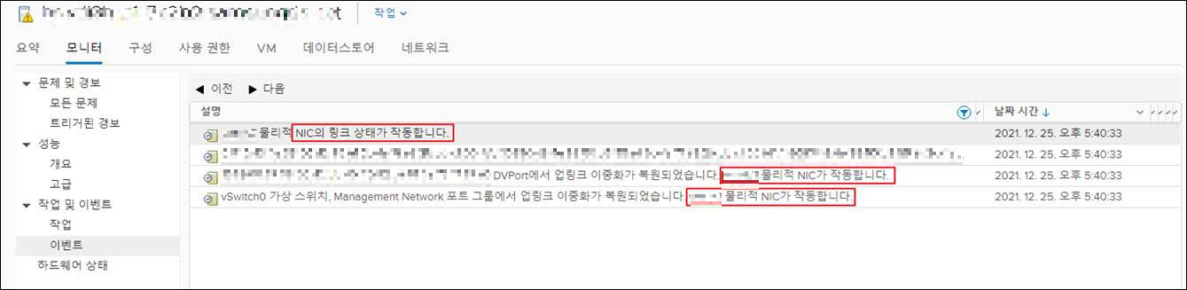 : vCenter 접속 -> 해당 호스트서버 선태 -> 모니터 -> 이벤트에서 "NIC 다운되었습니다." 확인