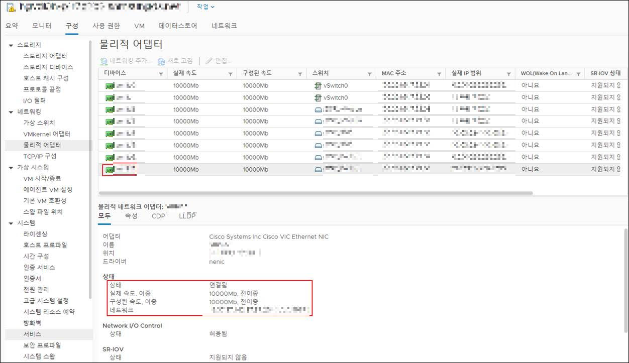 : vCenter 접속 -> 호스트서버 선택 -> 구성 -> 네트워킹 -> 물리적 어댑터 -> 해당 NIC 선택 "상태, 속도" 확인