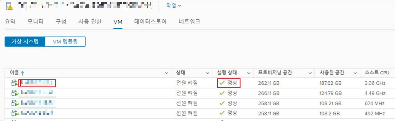 : vCenter 접속 -> 호스트서버 선택 -> VM 선택 -> VM 실행 상태 확인