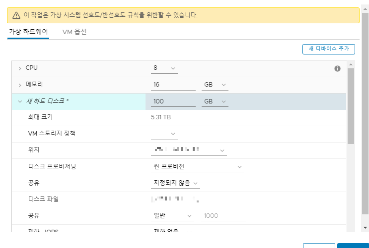 새 하드디스크 추가 시 이 작업은 가상 시스템 선호도/반선호도 규칙을 위반할 수 있습니다. 오류 발생