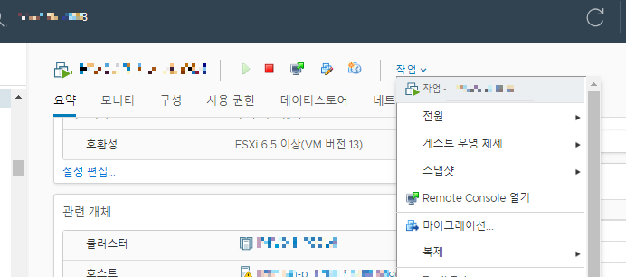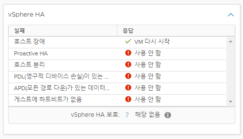 vSpaere HA 부분을 보면 아래와 보호에 ? 되어있음(정상은 체크 모양)
