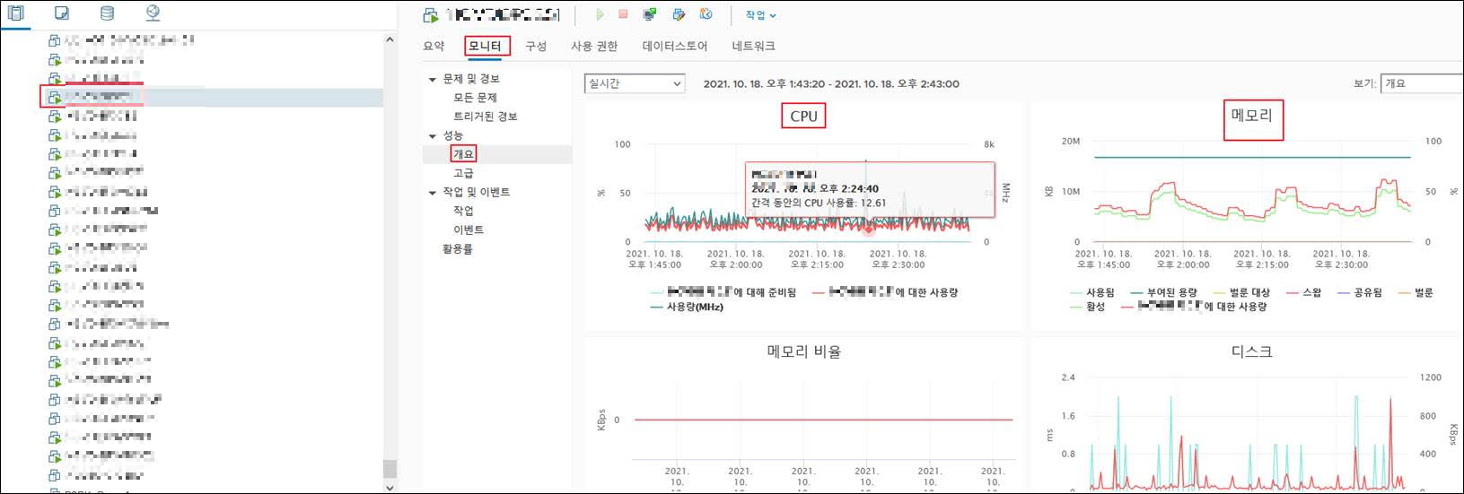 : ICMP 통신 불가 관리서버가 속한 vCenter 접속 -> 해당 VM을 선택 -> 모니터 -> 성능 -> 개요에 "CPU 및 메모리 사용량"