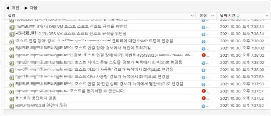 : 연결 끊김 발생 Host의 모니터 -> 이벤트 -> 연결끊긴 이벤트 확인