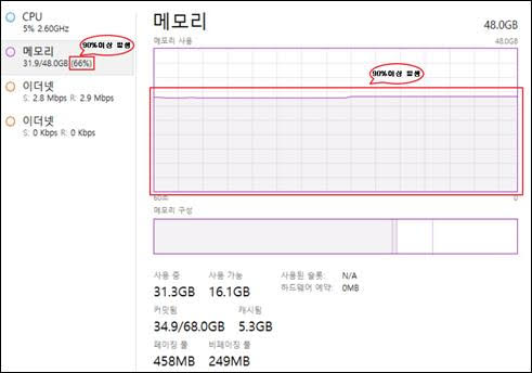 : vCenter OS 콘솔 접속 -> 작업 관리자 실행 -> 성능 -> 메모리 사용률 확인