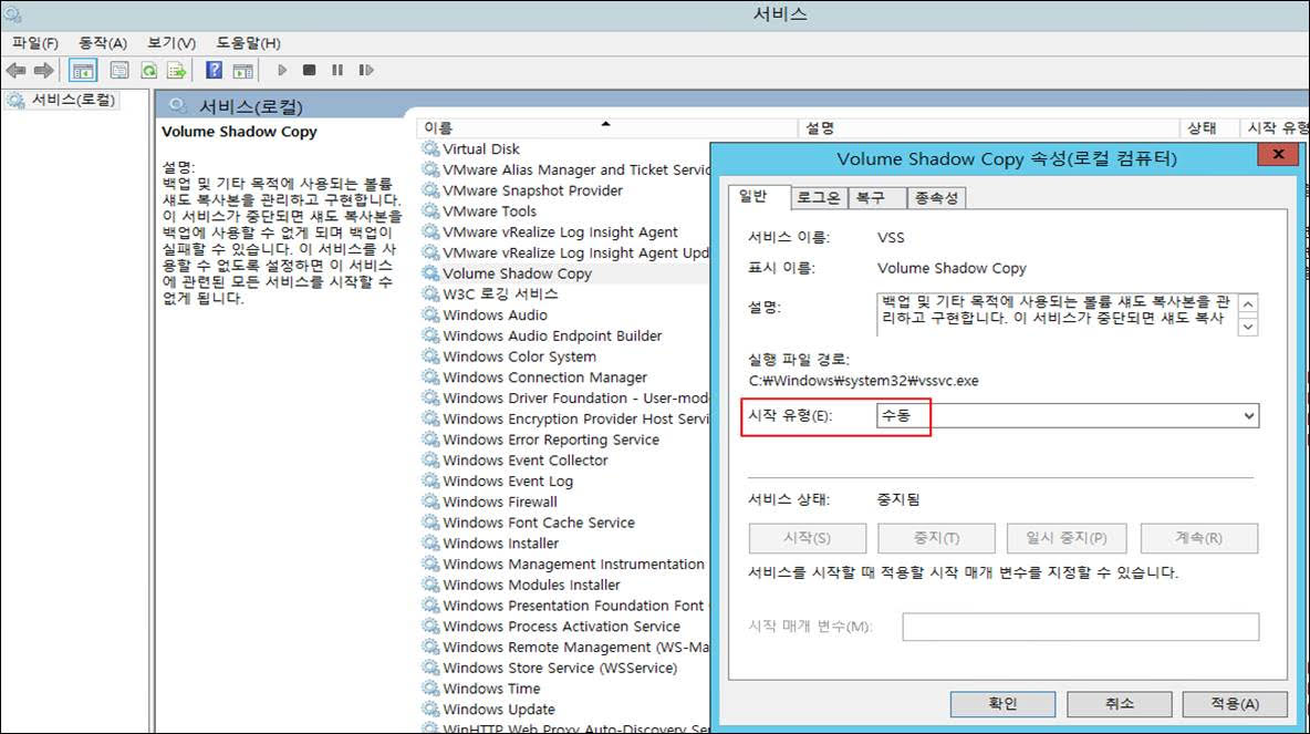: 백업 완료 후 Windows Service에서 아래 서비스 Startup Type을 "수동"으로 변경