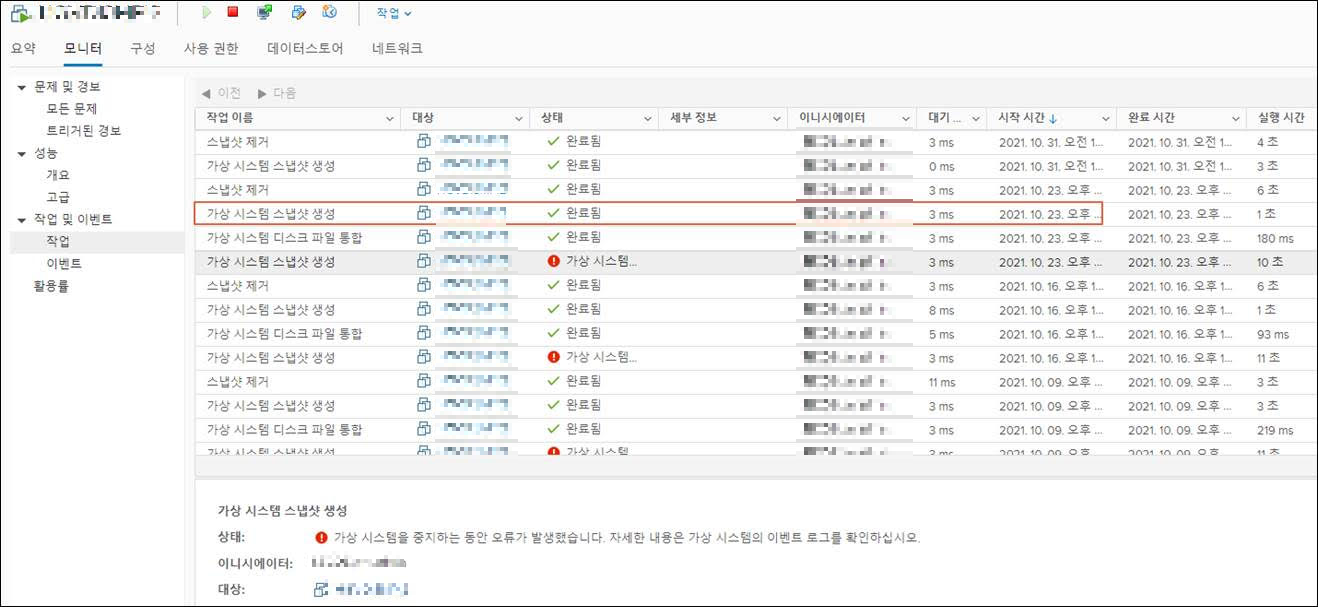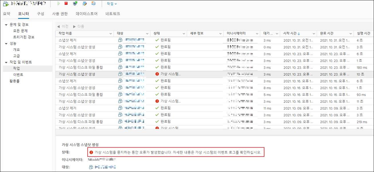- 관리 서버 정기 백업 수행중 "가상 시스템을 중지하는 동안 오류가 발생했습니다" 메세지 발생