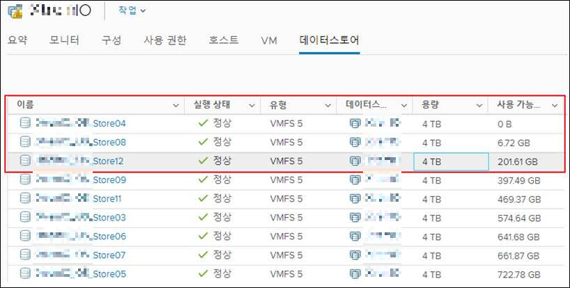 : 해당 vCenter 접속 -> 스토리지 -> 데이터스토어에서 사용가능 용량 확인