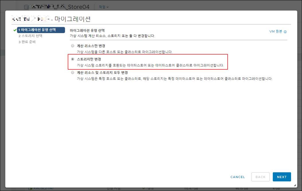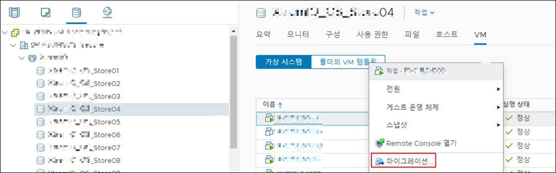 : 해당 vCenter 접속 -> 스토리지 -> 데이터스토어 -> VM -> VM 선택 후 팝업 메뉴에서 마이그레이션 선택