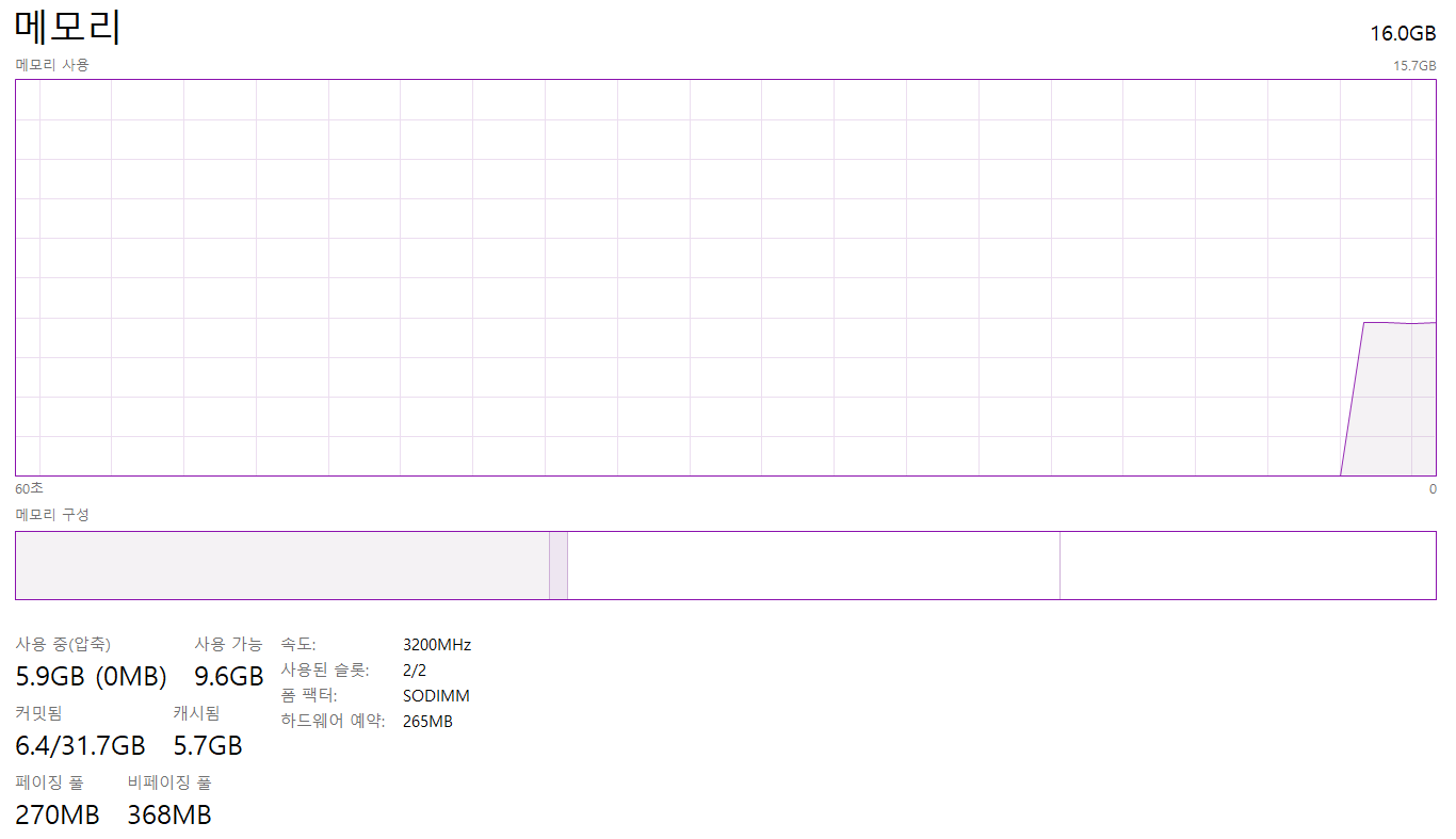 : vCenter OS 콘솔 접속 -> 작업 관리자 실행 -> 성능 -> 메모리 사용률 확인