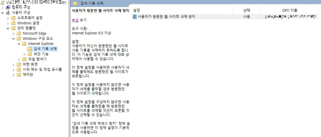 사용자 구성 > 관리템플릿 > Windows 구성 요소 > Internet Explorer > 검색 기록 삭제 > 사용자가 방문한 웹 사이트 삭제 방지 > 사용