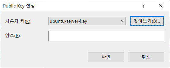 4-2. 연결 > 사용자 인증 > 사용자 이름 : ubuntu / 방법 : Public Key > 설정