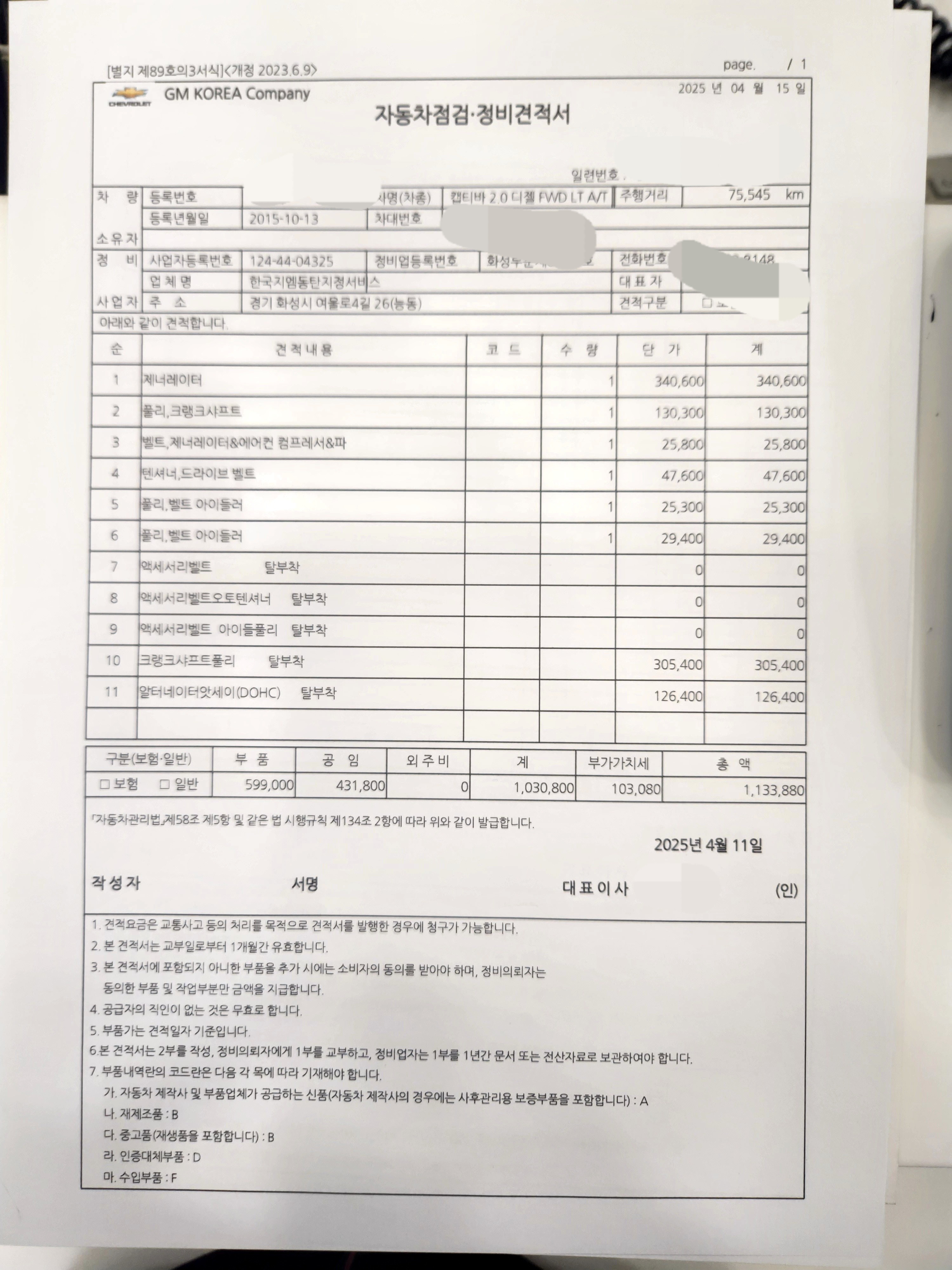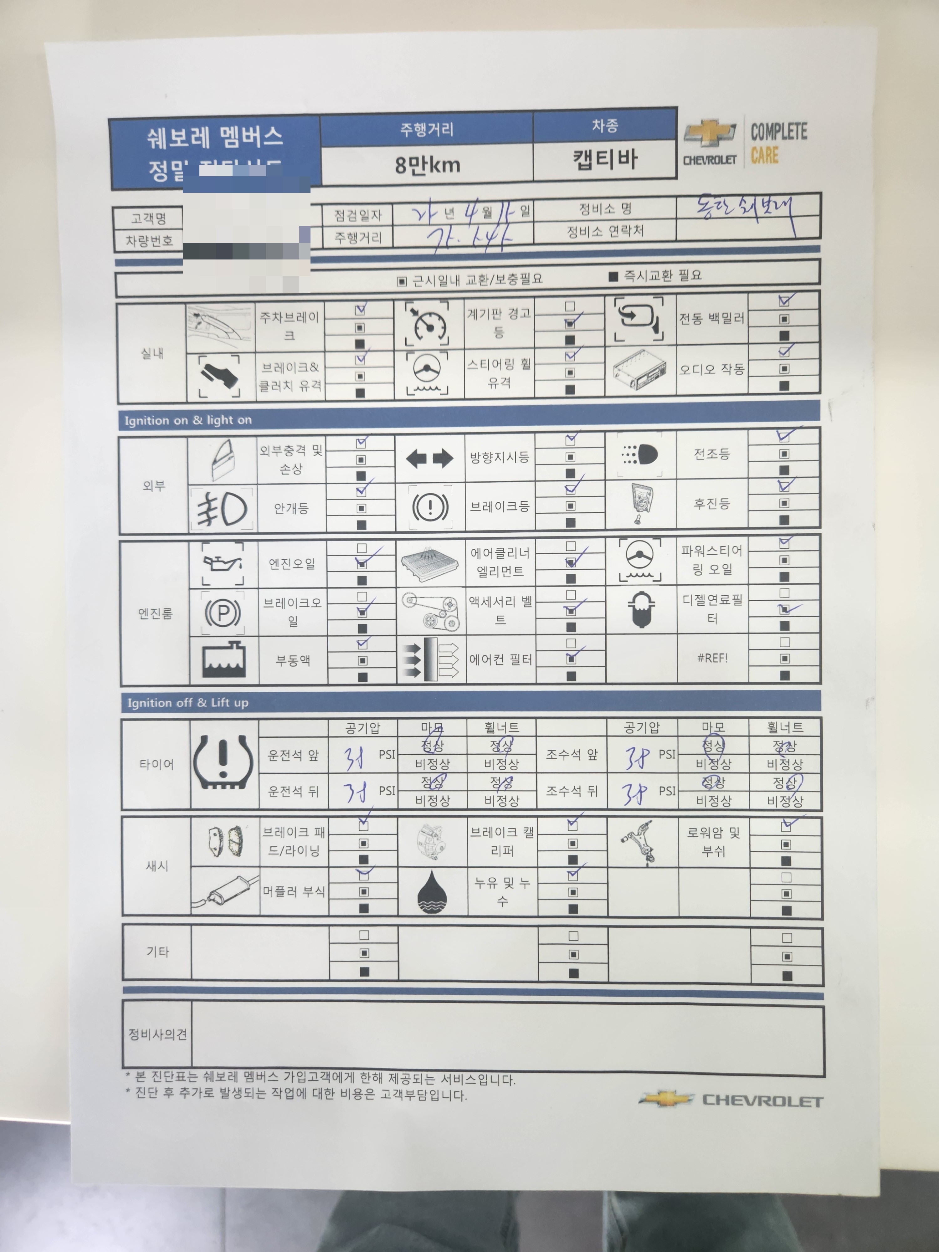 2015년식 캡티바 차량에 대한 정밀 점검을 위해 쉐보레 지정 정비소를 방문하였습니다.