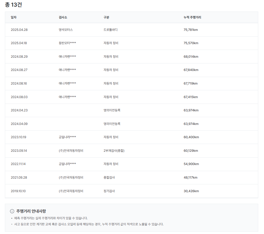 일단 샘플로 제 차량 조회 해봣는데요.