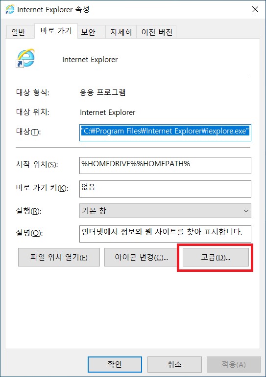 internet explorer 종료 > internet explorer 아이콘 오른쪽 버튼 > 속성