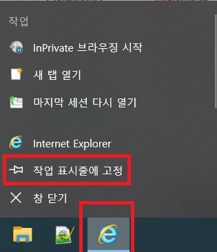 internet explorer 아이콘 오른쪽 버튼 > 작업 표시줄에 고정