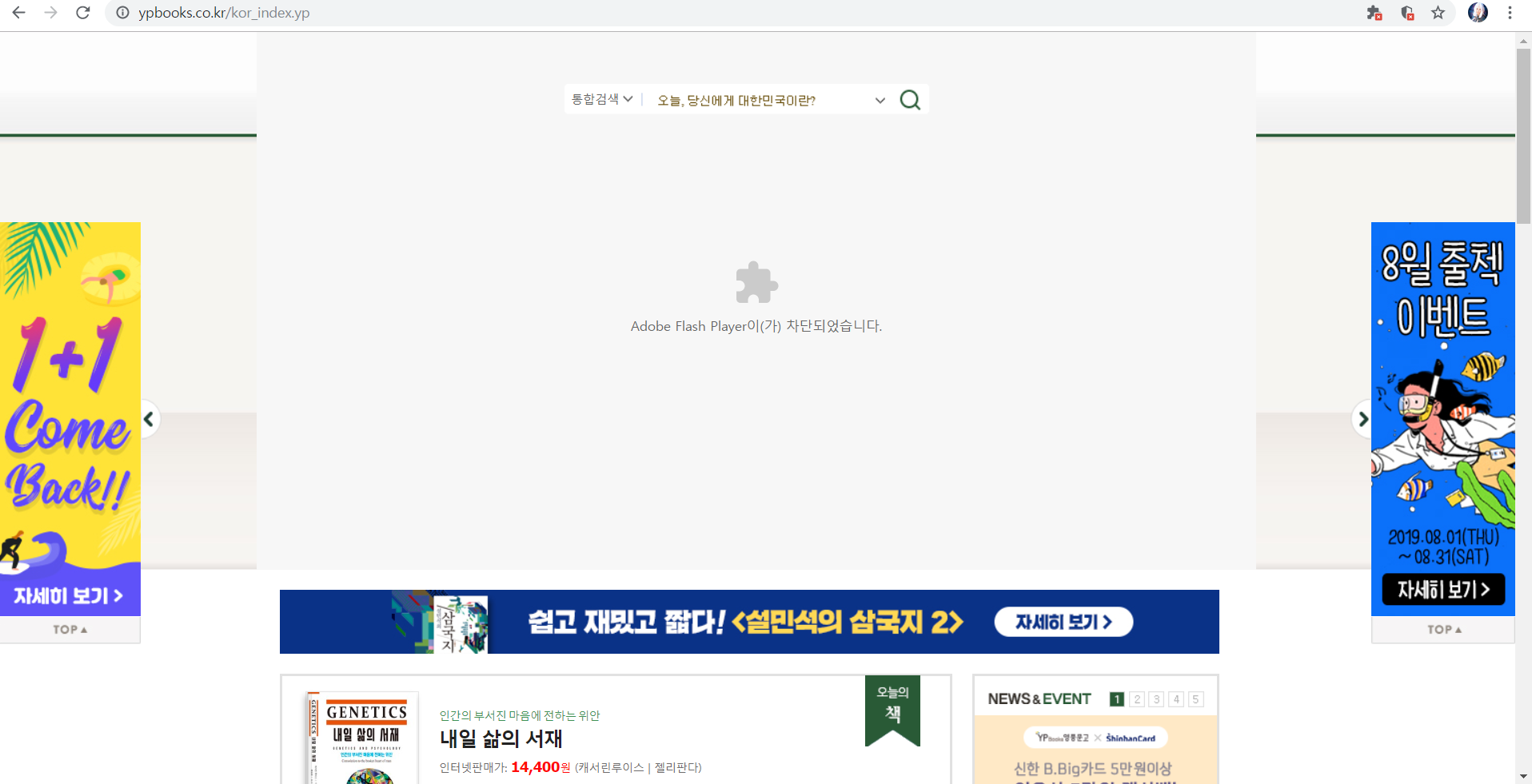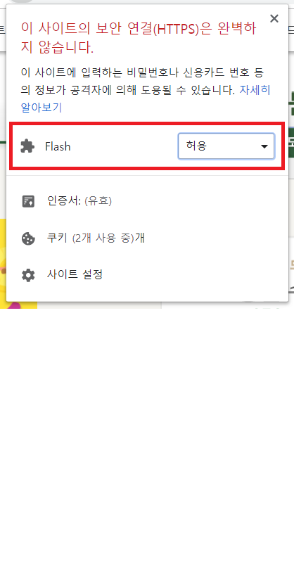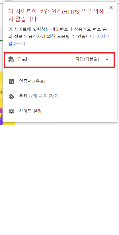 크롬에서 Flash Player을 지원을 하나 기본값이 차단이여서 벌어지는 현상으로 확인
