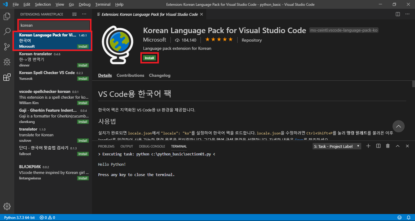korean > Korean Language Pack for visual Studio Code > Install > Reboot