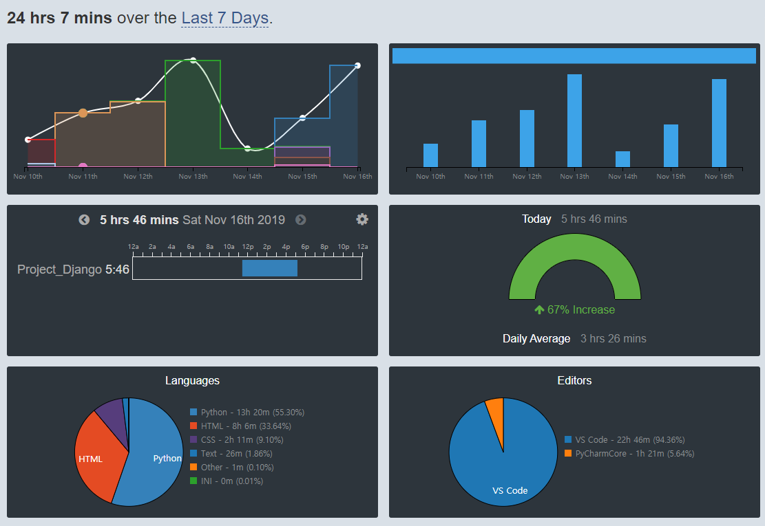 | [WakaTime]Week 1 of November(19.11.03 ~ 19.11.09) (0) | 2019.11.11 |