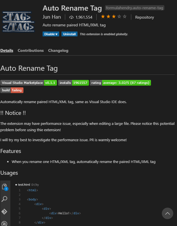 OverviewQ & ARating & Review Auto Rename Tag Automatically rename paired HTML/XML tag, same as Visual Studio IDE does. !! Notice !! The extension may have performance issue, especially when editing a large file. Please notice this potential problem before