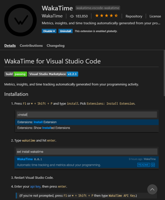 OverviewQ & ARating & Review WakaTime for Visual Studio Code Metrics, insights, and time tracking automatically generated from your programming activity. Installation Press F1 or ⌘ + Shift + P and type install. Pick Extensions: Install Extension. Type waka
