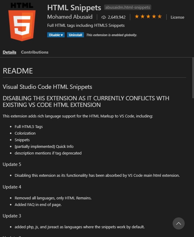 OverviewQ & ARating & Review README Visual Studio Code HTML Snippets DISABLING THIS EXTENSION AS IT CURRENTLY CONFLICTS WTH EXISTING VS CODE HTML EXTENSION This extension adds rich language support for the HTML Markup to VS Code, including: Full HTML5 Tags