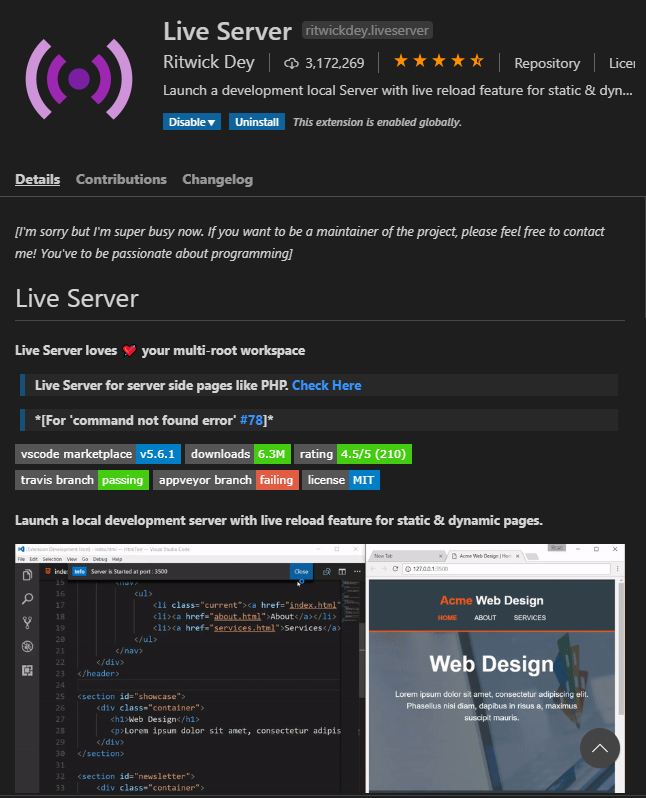 OverviewQ & ARating & Review [I'm sorry but I'm super busy now. If you want to be a maintainer of the project, please feel free to contact me! You've to be passionate about programming] Live Server Live Server loves 💘 your multi-root workspace Live Server