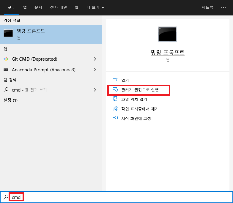 2. cmd / 명령 프롬프트 > 관리자 권한으로 실행