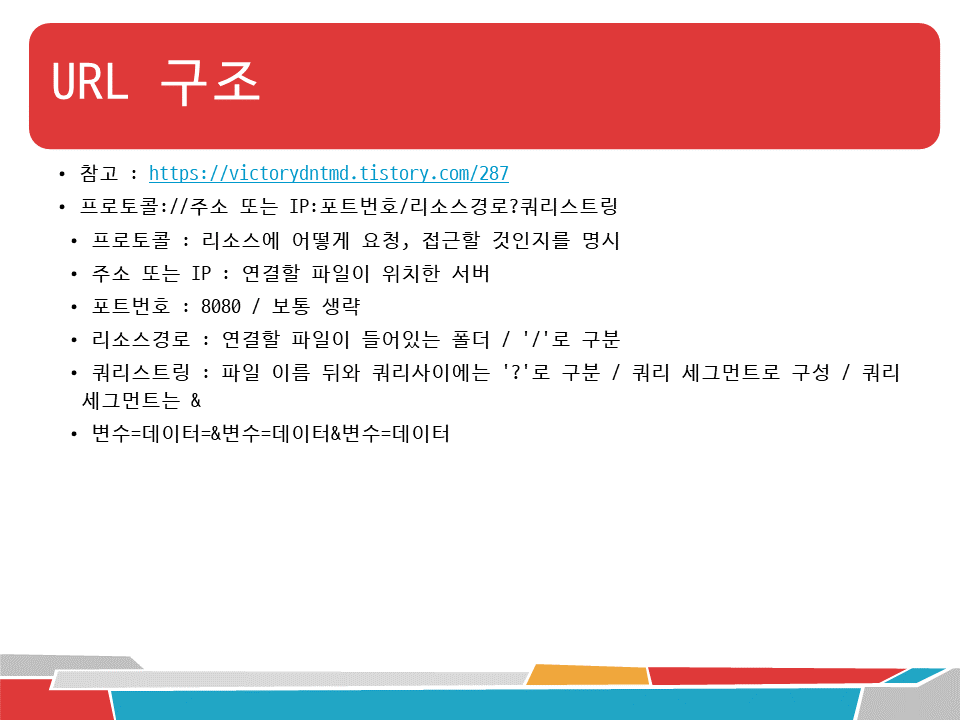 • 프로토콜://주소 또는 IP:포트번호/리소스경로?쿼리스트링