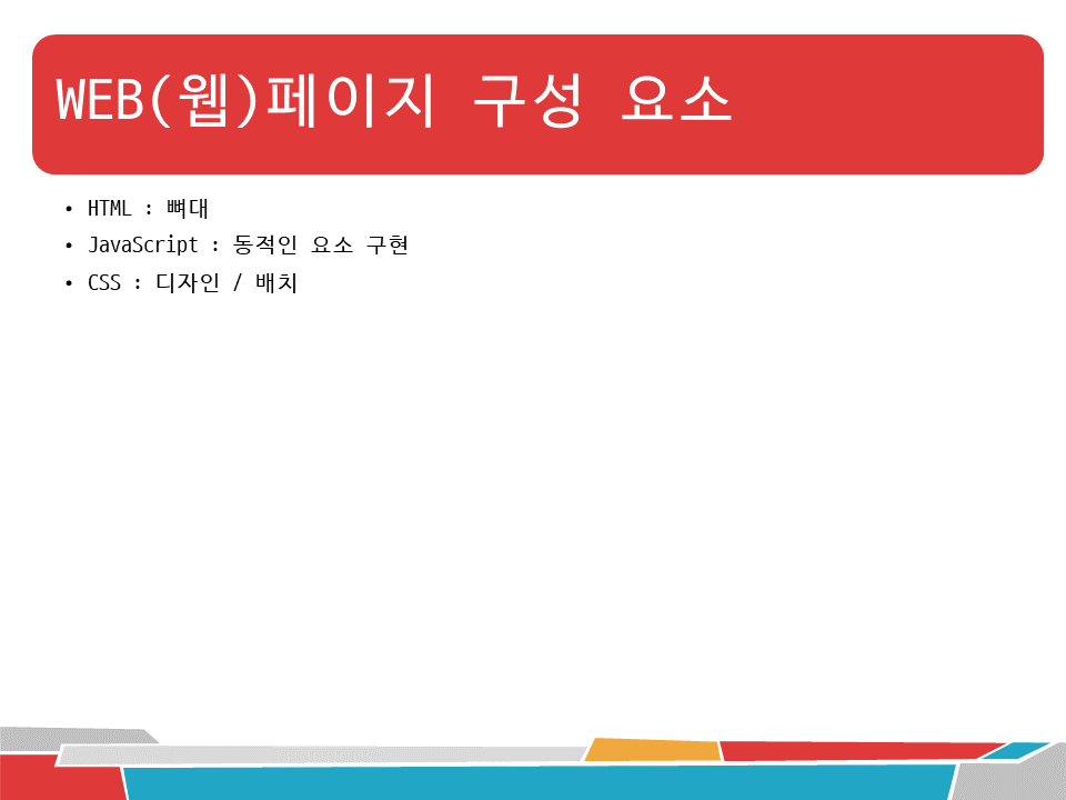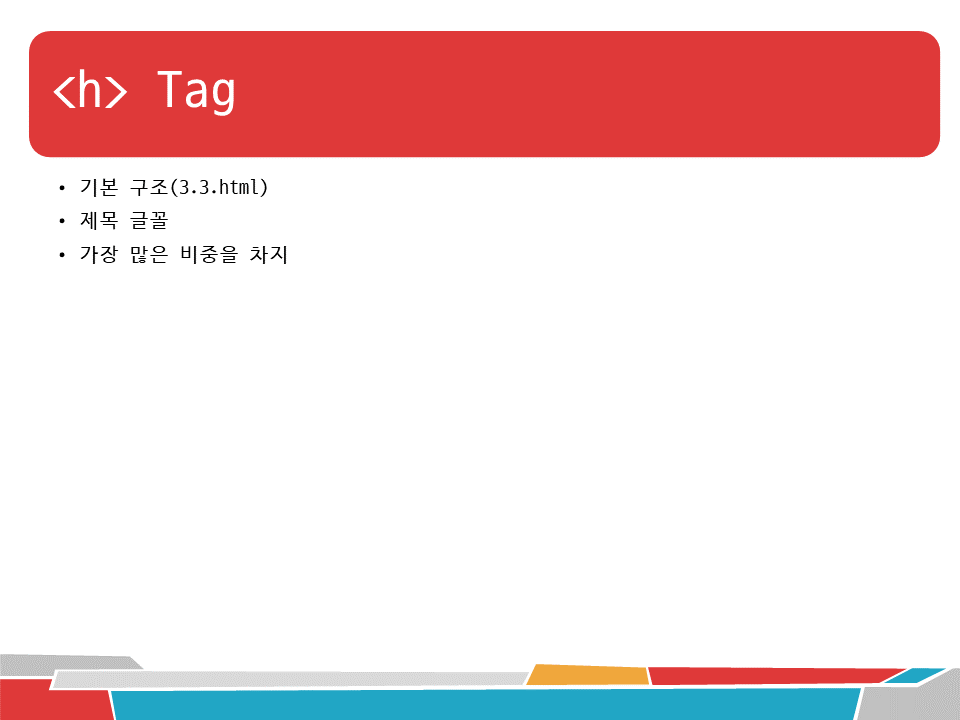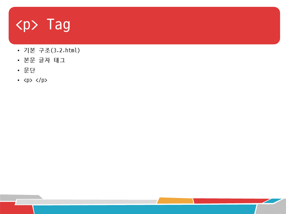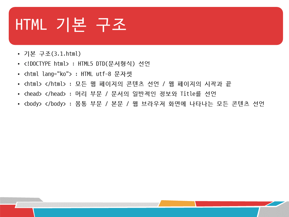 • <body> </body> : 몸통 부문 / 본문 / 웹 브라우저 화면에 나타나는 모든 콘텐츠 선언