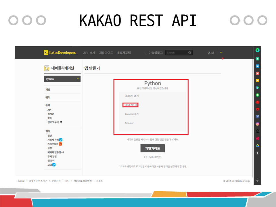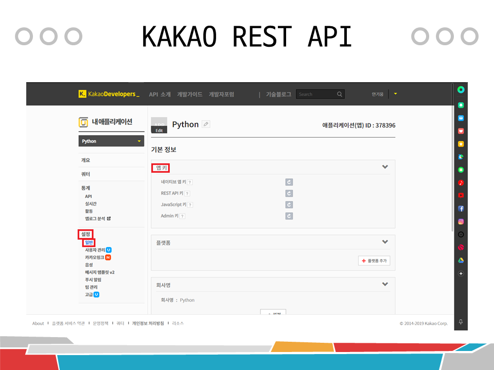 • 설정 > 일반 > 기본정보 > 앱 키 > REST API