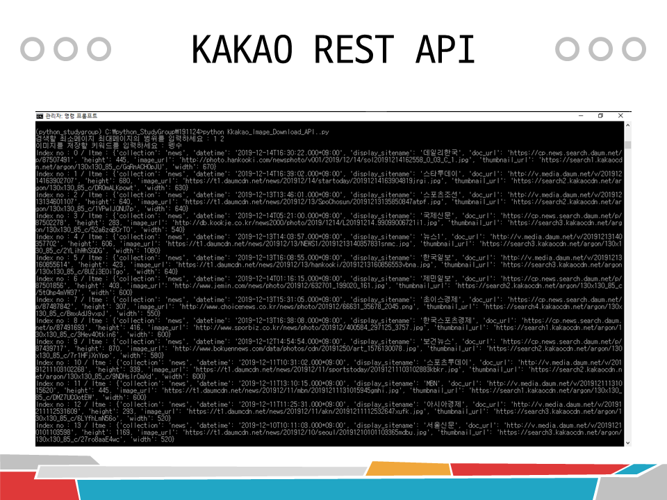 }Index no : 1 / Itme : {'collection': 'news', 'datetime': '2019-12-14T16:39:02.000+09:00', 'display_sitename': '스타투데이', 'doc_url': 'http://v.media.daum.net/v/20191214163902707', 'height': 680, 'image_url': 'https://t1.daumcdn.net/news/201912/14/startoday/20191214163904819jrgi.jpg', 'thumbnail_url': 'https://search2.kakaocdn.net/argon/130x130_85_c/DROmALKpowt', 'width': 630}