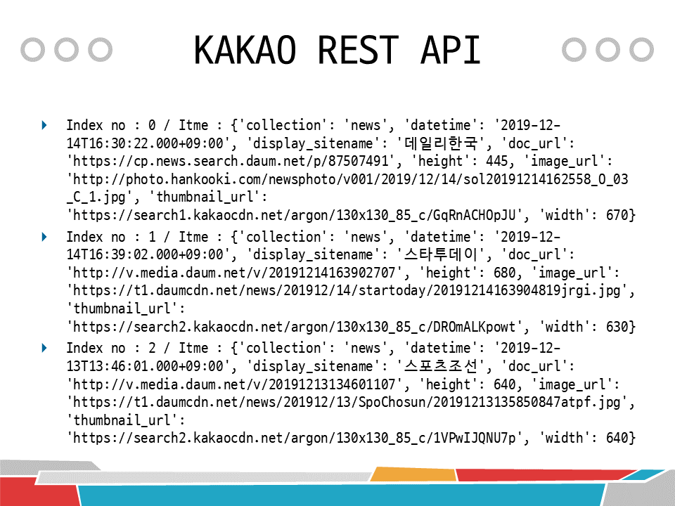 }Index no : 2 / Itme : {'collection': 'news', 'datetime': '2019-12-13T13:46:01.000+09:00', 'display_sitename': '스포츠조선', 'doc_url': 'http://v.media.daum.net/v/20191213134601107', 'height': 640, 'image_url': 'https://t1.daumcdn.net/news/201912/13/SpoChosun/20191213135850847atpf.jpg', 'thumbnail_url': 'https://search2.kakaocdn.net/argon/130x130_85_c/1VPwIJQNU7p', 'width': 640}