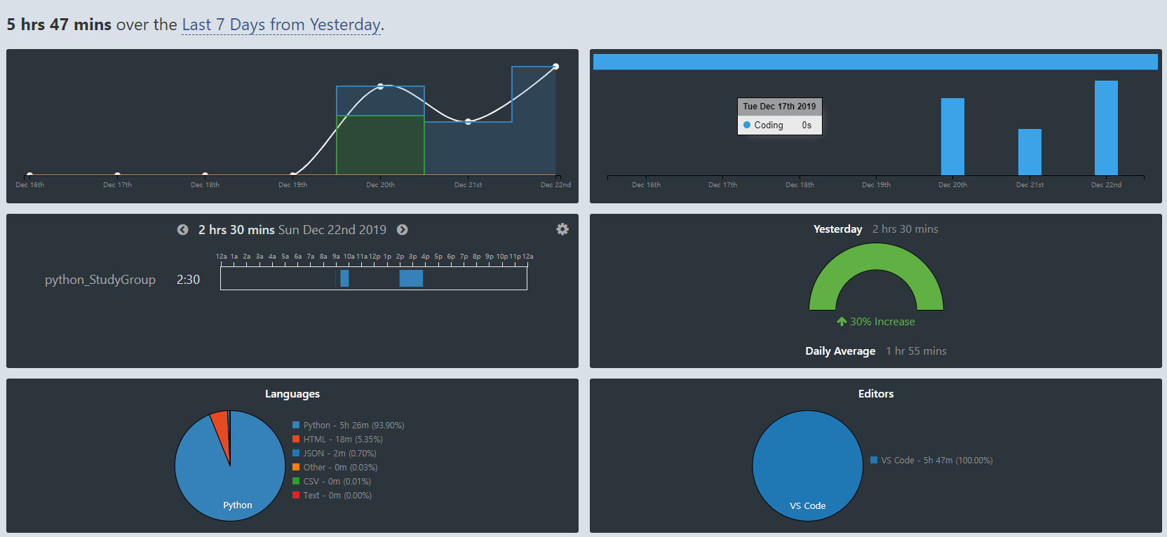 | [WakaTime]Week 2 of November(19.11.10 ~ 19.11.16) (0) | 2019.11.16 |