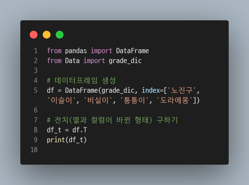 # 전치(열과 컬럼이 바뀐 형태) 구하기