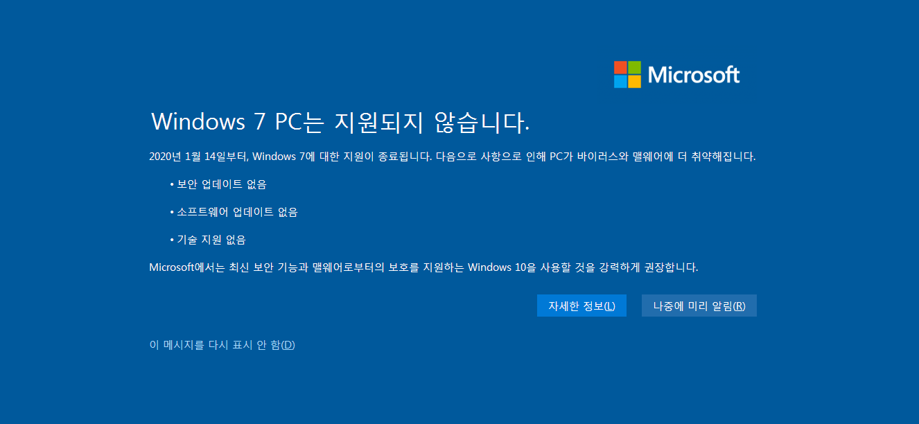 2020년 1월 14일 부로 Windows 7은 지원종료가 되었다.