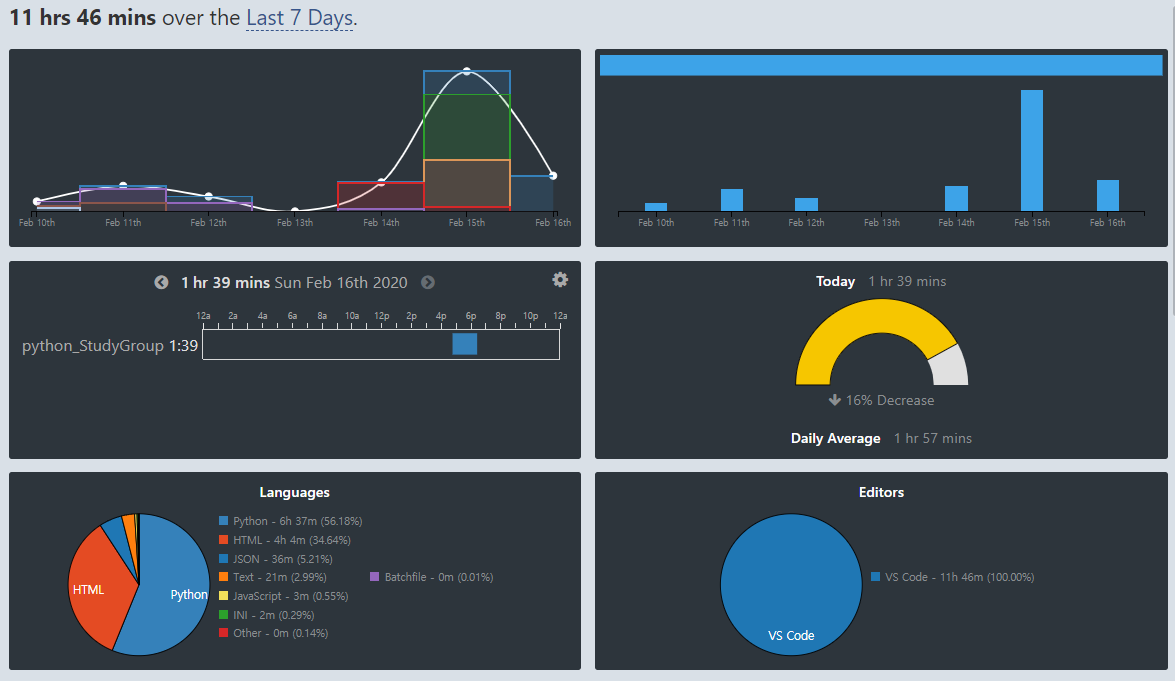 | [WakaTime]Week 1 of February(20.02.03 ~ 20.02.09) (0) | 2020.02.16 |