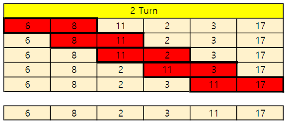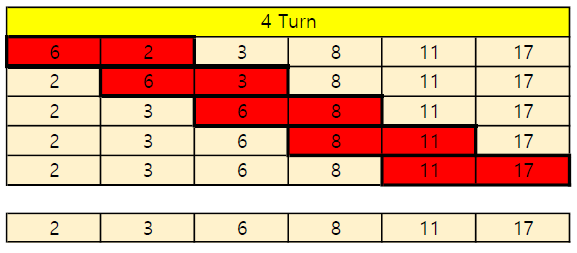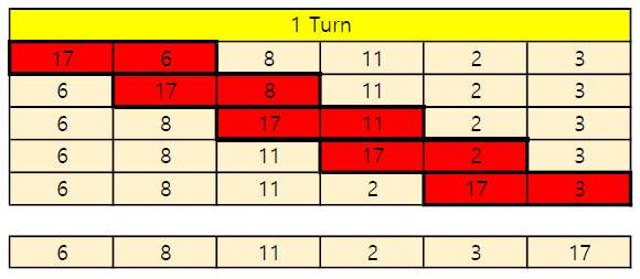 17 6을 비교해서 17이 크므로 뒤로 보내고 6을 앞으로 보낸다.