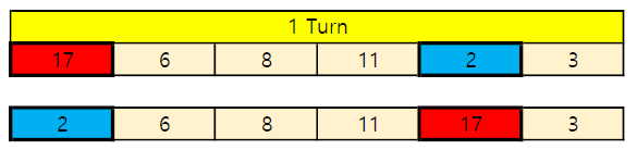이를 기준점인 17과 비교하면 2가 작으므로 맨 앞으로 보낸다.