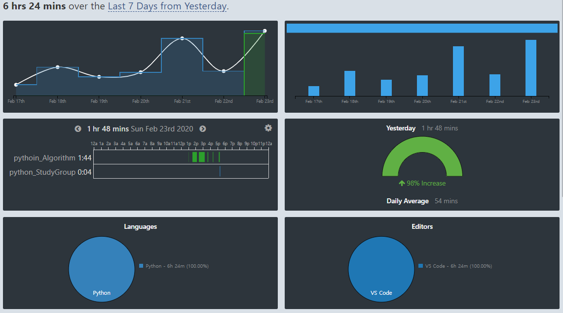 | [WakaTime]Week 1 of February(20.02.03 ~ 20.02.09) (0) | 2020.02.16 |