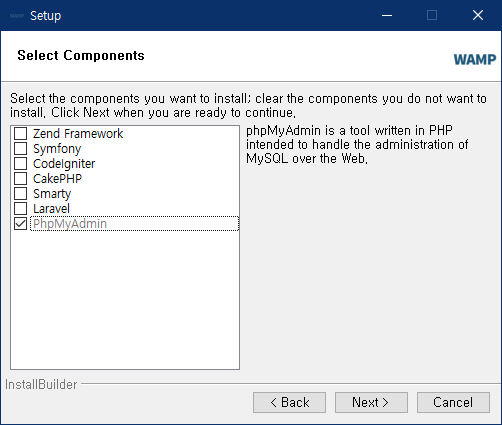 PhpMyAdmin만 남기고 모두 체크 해제