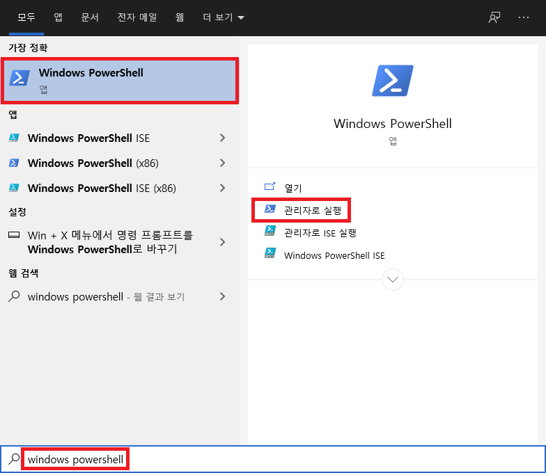 1. 시작 > Windows PowerShell > 관리자로 실행