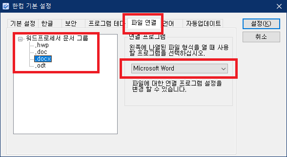 여기서 Word를 선택하고 설정을 누르면 된다.